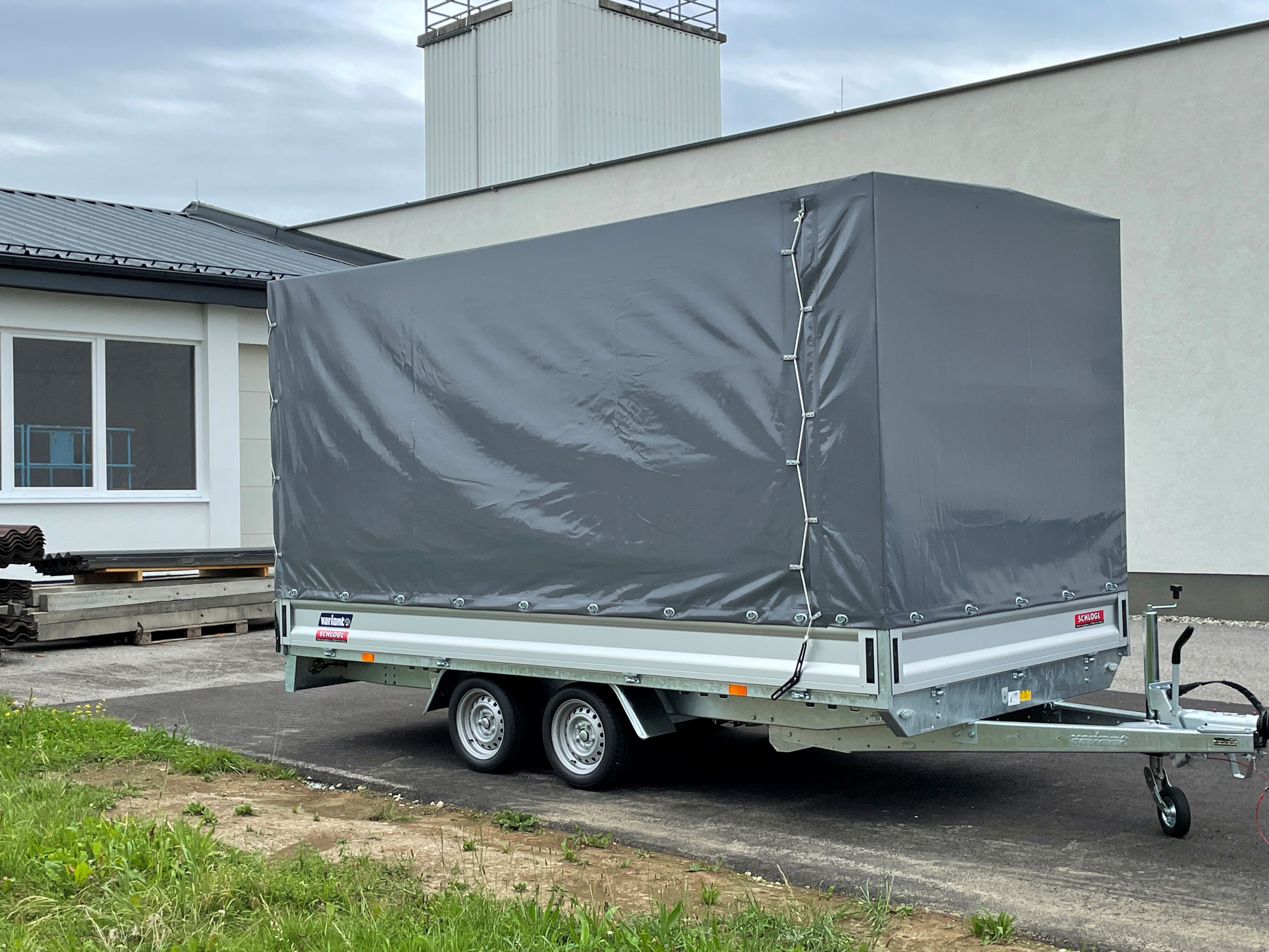 Durch die stabile Bauweise und die große Ladefläche lassen sich verschiedenste Materialien sicher und effizient transportieren. Die Tandemachse sorgt für ein ruhiges Fahrverhalten und hohe Stabilität.